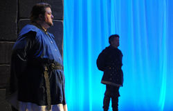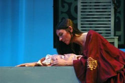 Director Jan Blixt is meticulous in her mood-setting with Jeromy Hopgood's austere Sicilian set and Renae Pedersen Skoog's dark, medieval costuming immediately alerting the audience that there is little of airy hope in this land. While many productions of Winter's Tale will allow a few brief moments of affection between Leontes and his delightfully hospitable queen, Hermione, there is no such warmth in this king. The queen and all the subjects stand apart until the king bids them do otherwise. Even in the opening scene, Leontes stands in the background glowering, a foreshadow of the tyrant that he will become. We never see the king who has inspired the warm friendship of Polixenes, devoted love of Hermione and faithful service of Camillo, Paulina and others.